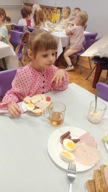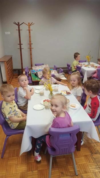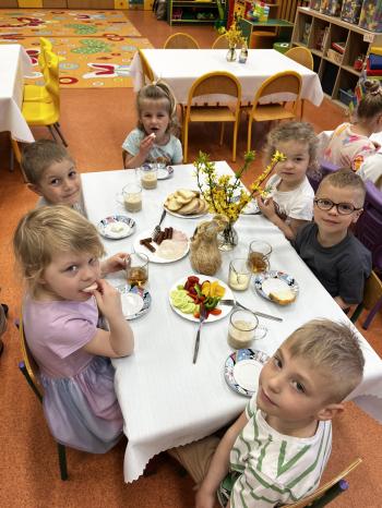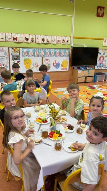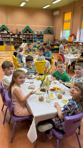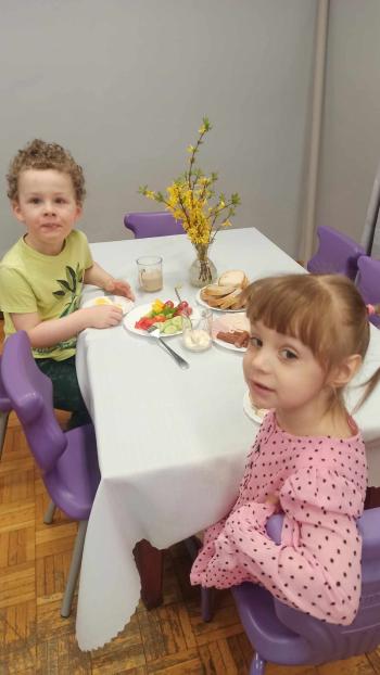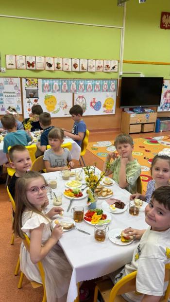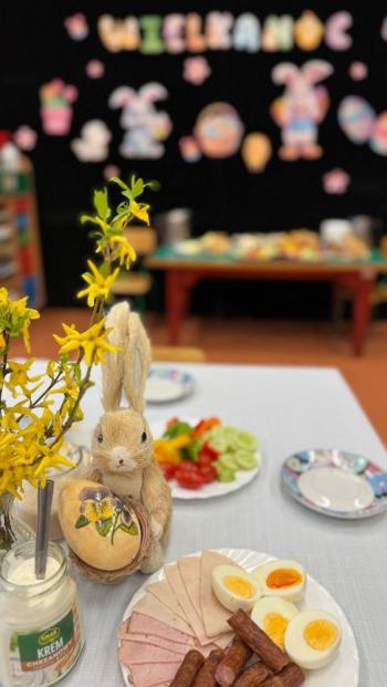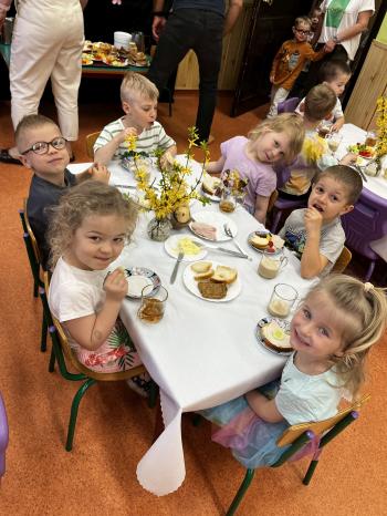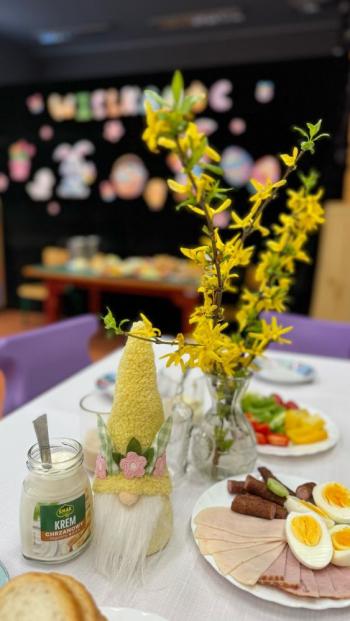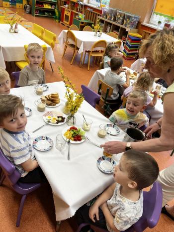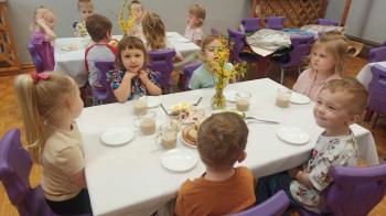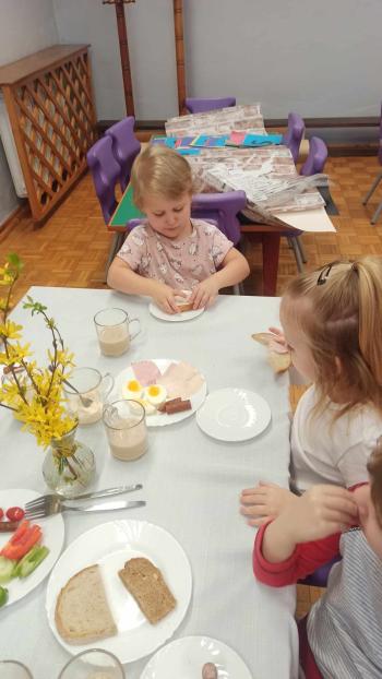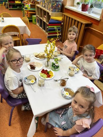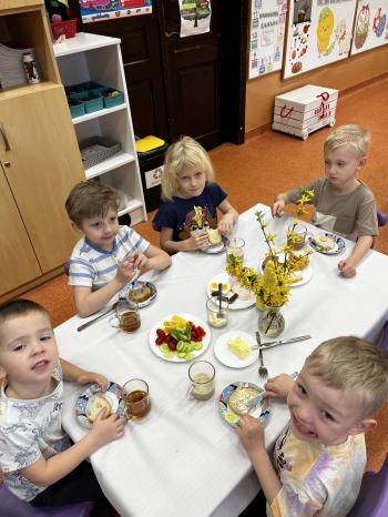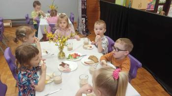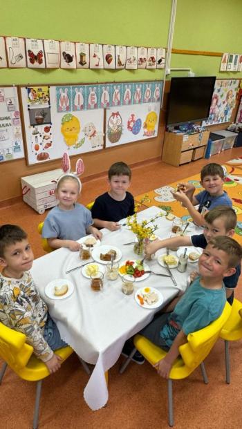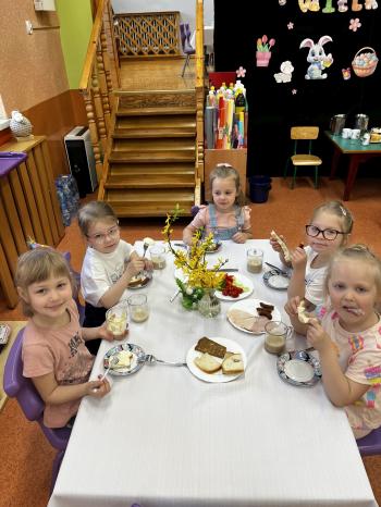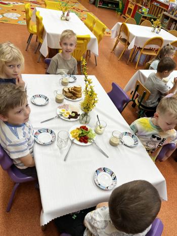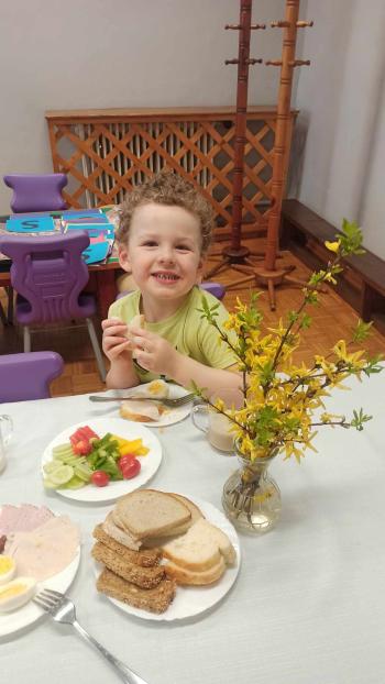 W naszym przedszkolu 17 kwietnia dzieci z grupy „Słoneczek”, „Kaczuszek” oraz „Żabek” usiadły przy świątecznie przystrojonych stołach do uroczystego wielkanocnego śniadania, które miało charakter „szwedzkiego stołu”. Rozpoczęło się ono od złożenia życzeń wielkanocnych. Ta uroczystość nawiązywała do polskiej tradycji i miała na celu wzmacnianie więzi społecznej i rodzinnej. |