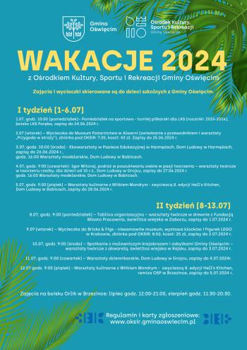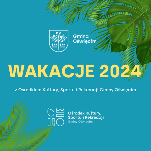 Zapraszamy dzieci z gminy Oświęcim w wieku szkolnym do udziału w zajęciach i wycieczkach w terminie 1-12.07.2024 w ramach Wakacji 2024 z Ośrodkiem Kultury, Sportu i Rekreacji Gminy Oświęcim.