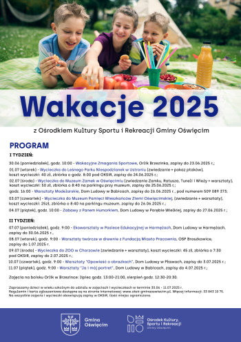 Zapraszamy dzieci z gminy Oświęcim w wieku szkolnym do udziału w zajęciach i wycieczkach w terminie 30.06 - 11.07.2025 w ramach Wakacji 2025 z Ośrodkiem Kultury, Sportu i Rekreacji Gminy Oświęcim.