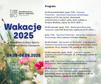 Zapraszamy dzieci z gminy Oświęcim w wieku szkolnym do udziału w zajęciach i wycieczkach w terminie 04.08 - 08.08.2025 w ramach Wakacji 2025 z Ośrodkiem Kultury, Sportu i Rekreacji Gminy Oświęcim.