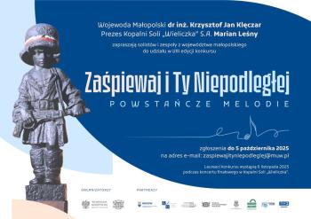 W imieniu organizatorów zapraszamy na VIII edycję konkursu wokalnego „Zaśpiewaj i Ty Niepodległej!" – muzycznej inicjatywy, która już na stałe wpisała się w kalendarz małopolskich obchodów niepodległościowych. Wojewoda Małopolski dr inż. Krzysztof Jan Klęczar oraz Prezes Kopalni Soli „Wieliczka” S.A. Marian Leśny zachęcają utalentowanych solistów i zespoły z województwa małopolskiego do udziału w tegorocznej edycji konkursu.