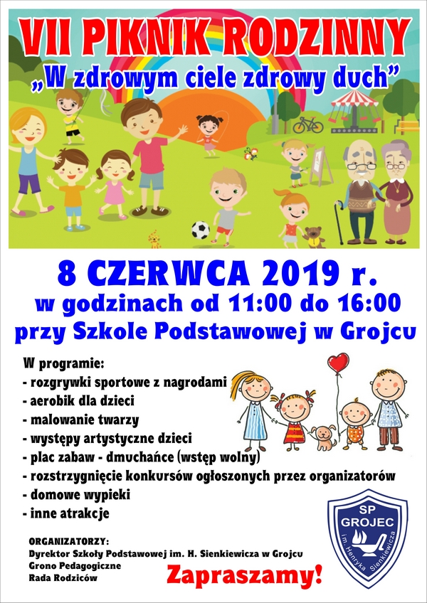 Rada Rodziców, Dyrektor oraz Grono Pedagogiczne Szkoły Podstawowej im. H.Sienkiewicza w Grojcu zapraszają rodziców wraz z dziećmi na Piknik Rodzinny "W zdrowym ciele zdrowy duch" w sobotę, 8 czerwca 2019 w godz. 11.00-16.00.